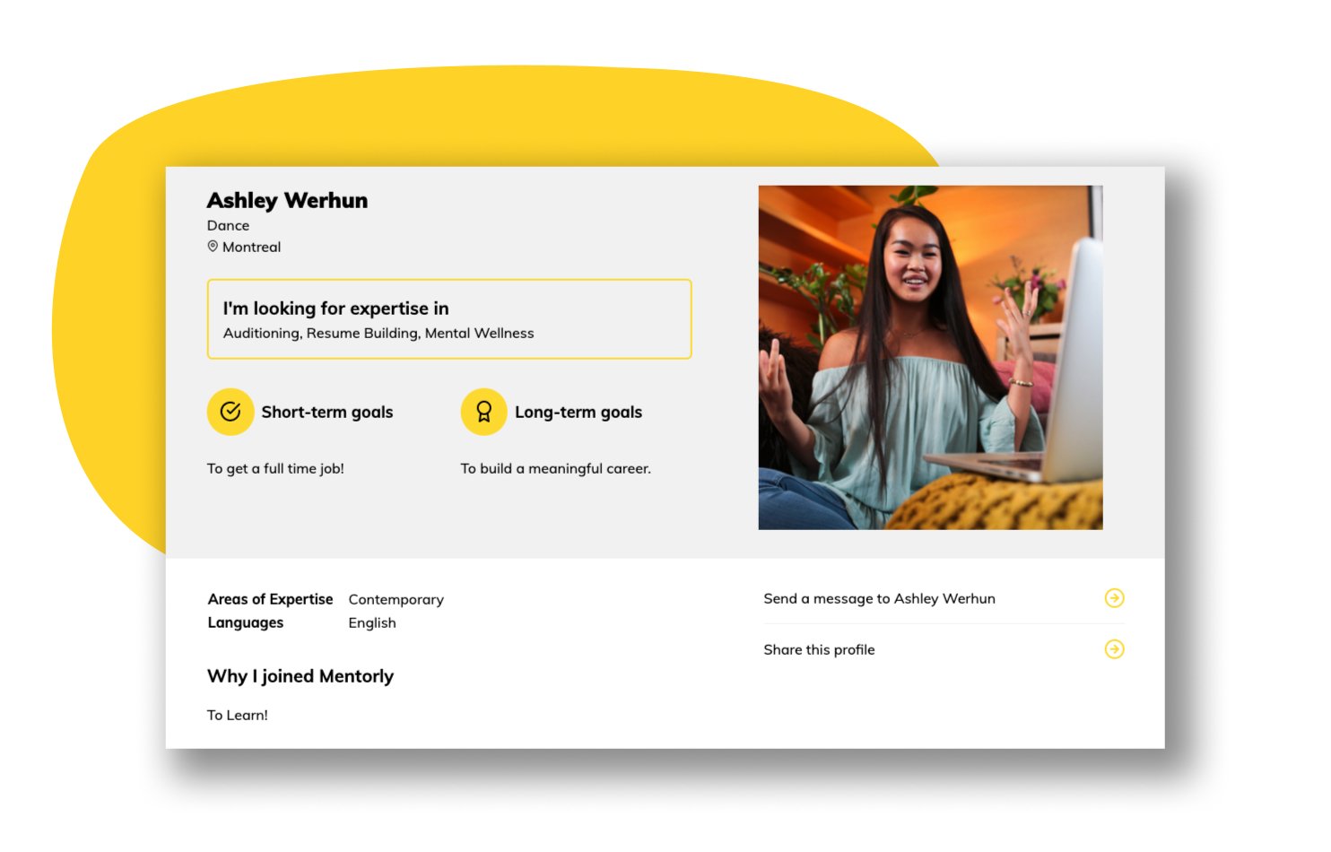 Introducing mentee profiles! It’s your space to write about your goals and what you’re looking for out of Mentorly and your sessions. Your mentors will be able to see your profile as soon as you book which helps them prepare to guide you.