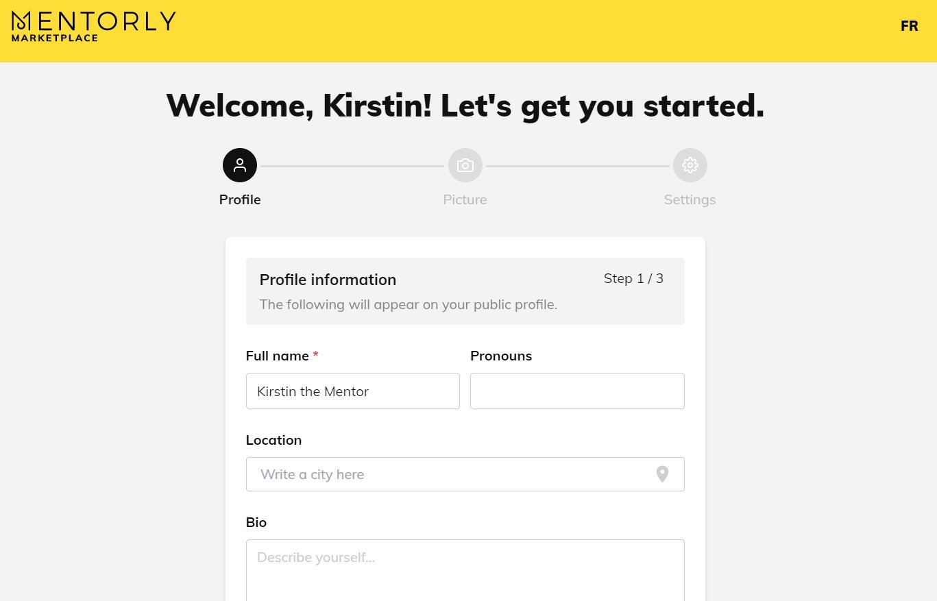 Une fois que vous vous êtes inscrit.e, Mentorly vous guidera à travers quelques étapes d'intégration qui vous permettront de commencer à créer votre profil de mentor.e.