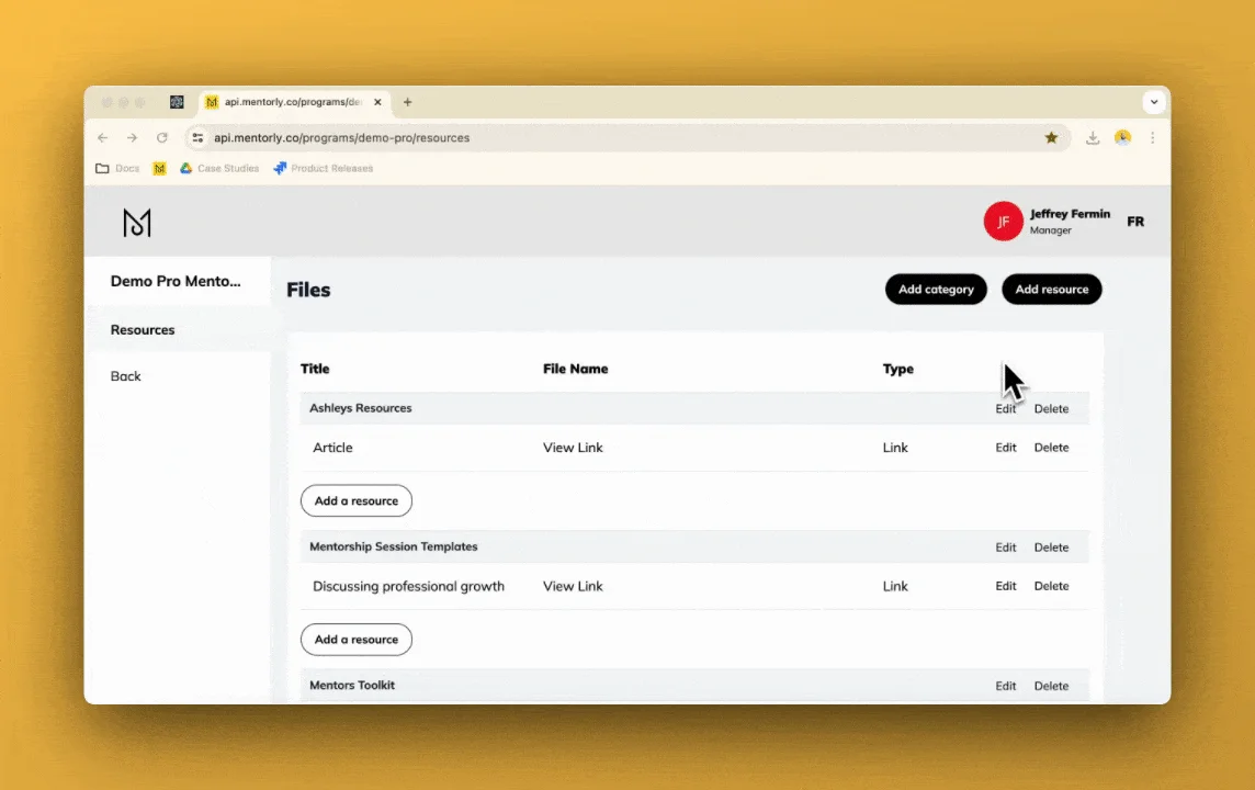 To access Resources, Mentors and Mentees simply need to log in to their Mentorly account and click on Resources in the left-hand side menu. The list of available resources will appear, along with icons to identify the type of file each resource is.