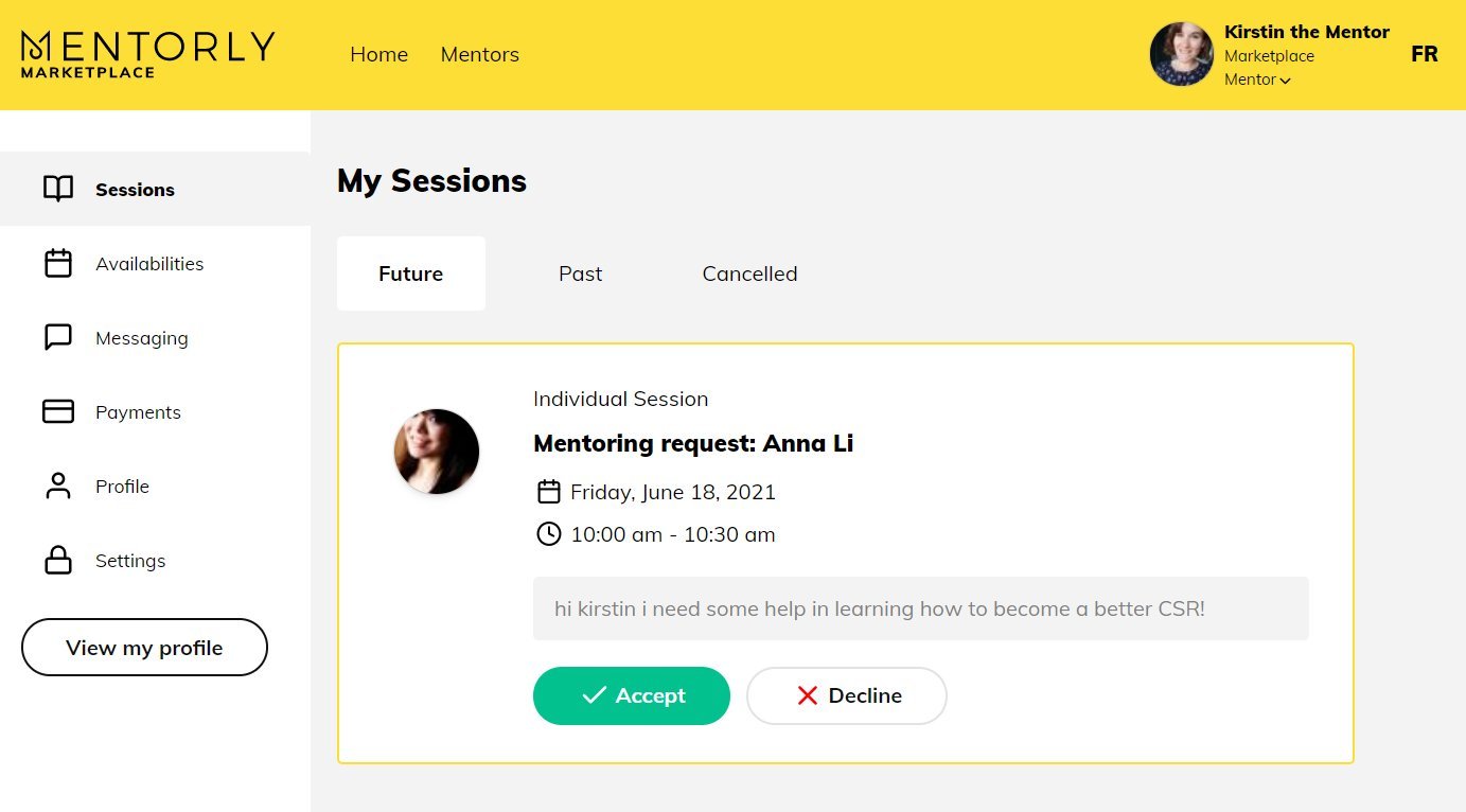 Lorsqu'une séance est demandée, vous pourrez consulter le nom du ou de la mentoré.e qui l'a demandée, la date et l'heure, ainsi que son message qui expliquera ce dont il ou elle aimerait discuter pendant la séance.