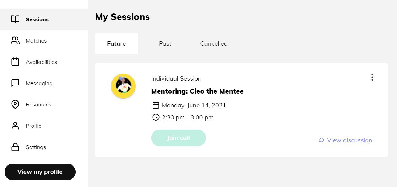 Si vous acceptez une demande de réservation, votre mentoré.e en sera informé.e et vous recevrez tous les deux un e-mail de confirmation de la réservation. Vous la verrez également sous l'onglet « Séances > Future ».